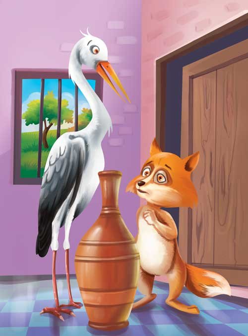 Once a stork was invited to the dinner by a selfish fox at his home. The stork reached the fox’s home and knocked at the door with her long beak. The fox welcomed her with open arms and offered to have dinner together. The fox served soup in shallow bowls for both. As the bowl was too shallow for the stork’s beak, she couldn’t have any of it but the fox licked up all his soup very quickly. The poor stork went ballistic but remained polite and ravenous. To show retaliation against the fox, the stork also invited him to the dinner next day. This time again, soup was served, but in tall jugs. The stork devoured the soup easily but the fox couldn’t reach inside the tall jug. This time the fox remained famished.