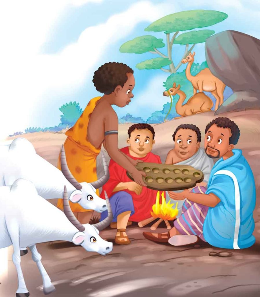 The boy came across a woodcutter who asked him for his axe. “Lend me your large axe. My axe is too small.” He gave the woodcutter the axe, and the woodcutter chopped the tree but the axe broke. The boy cried, and the woodcutter said, “Never mind; here is a branch of a tree.” The boy took the branch upon his back and as he came near the village a woman said, “I need wood for my fire. Can you give me this branch?” The boy gave the branch to her, and she put it in the fire. As it started burning, he said, “Where is my wood?” “Here,” the woman said as she gave him a fine gebeta board. He took the gebeta board under his arm and went home with the cattle. As he stepped inside the house, his father smiled and said, “What is better than a gebeta game board to keep a small boy out of trouble?”