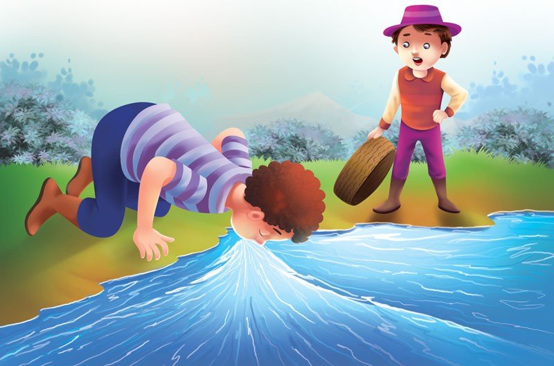 On reaching the seashore, the first brother said, “I will suck the sea in my mouth. You go and gather as many fish as you want from the bottom.” But the boy became fascinated with the corals at the bottom.