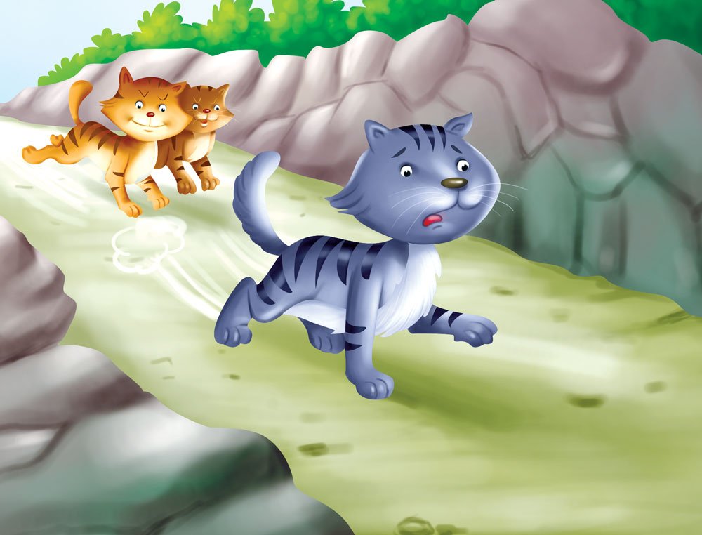 Tolstoy Tom was a greedy tom-cat. He roamed about here, there and everywhere in search of left-over foodstuff. When he found nothing anywhere, he would wait for hours for the neighbours to place their trash outside. He would slurp tasty tit-bits from it. Eating infected left-over food often made him sick. Many a time he needed to be taken to the vet. But Tolstoy Tom never learnt his lesson. One day, he found a group of alley cats eating away from the trash can. ‘Oh, this is the best opportunity for me. I must join them,’ thought Tolstoy Tom. He snuggled up to them as usual to grab a bite to eat. When the alley cats saw him, they began to chase him. Tolstoy Tom ran for safety. With great difficulty, he found a place to hide. From then on, Tolstoy Tom stopped being greedy for food.