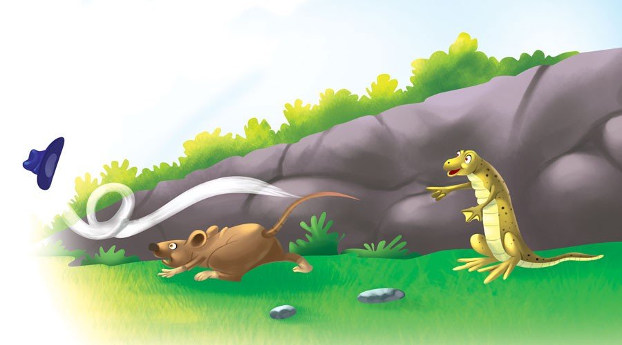 Long ago, in a land faraway, there was a mouse. He was considered the meanest and scariest mouse in the land. Even the cats would run away in fright at the mere sight of his shadow. He used to terrorize everyone with his wide-brimmed cowboy hat pulled tightly onto his head. One day, as usual, when he was terrorizing a small lizard, there came a sudden gust of wind. And well, it blew off the mouse’s hat! The small lizard rolled around with laughter. With the hat gone, the mouse did not look menacing at all. He had a soft tuft of hair like all the other mice. He looked like any ordinary small mouse. There was nothing scary about him. The hat was the secret weapon to frighten others. The mouse was so embarrassed that he ran off never to be seen again.