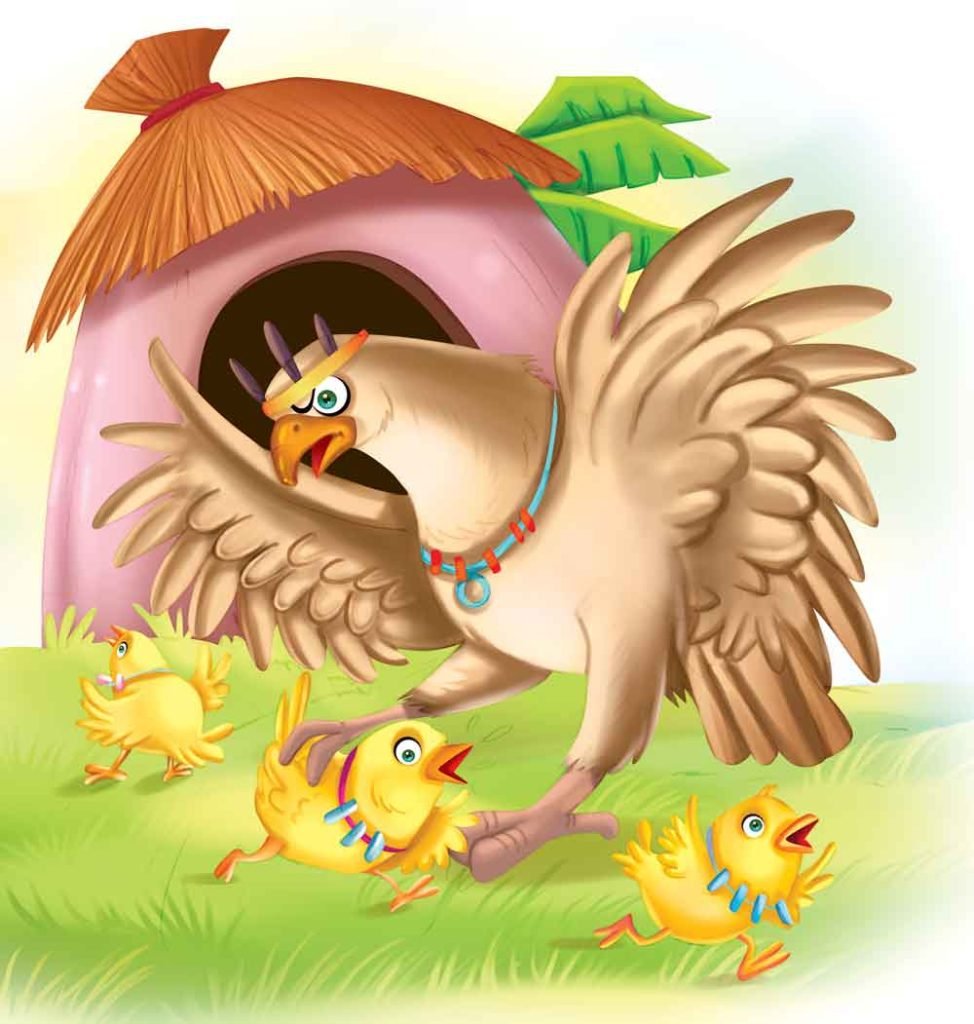 But the hen saw the spider, picked him up and handed him over to her chickens to eat. Meanwhile, the kite kept waiting for the spider. After waiting for some time, she went out to meet the spider. Behind the tree, she saw a bag with medicine bottles and a sheet of paper. She picked up the sheet and read, “To the Kite. I was on my way to your home, when I met the hen who ate me up.” Afraid, the kite flew back to her little son. But the poor child had already died. Furious, the kite wanted to take revenge and began eating chickens. And now, the kite always catches chickens and, eats them. And whenever a person caught a hen, it cried out, “It was not I! It was not I!” It wanted to say, “I did not eat the spider! Not I! Not I!”