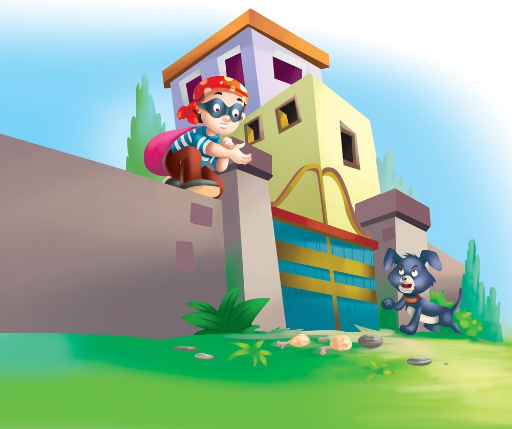 There was a thief. He had burgled many houses. One day, he saw a very big house. The thief decided to rob it. But, there was a problem. A huge dog guarded the house. The thief decided to take some meat for the dog so that he might not create a ruckus. So, he came to the house at night along with the meat. The dog was standing near the gate. The thief threw towards him the pieces of meat. But, the dog did not eat the meat. Instead, he said to the thief, “If you think you can stop me from barking and biting, you are mistaken. I will never betray my master for the meat you offer.” The thief was scared after hearing this. He did not try to come inside and ran away.