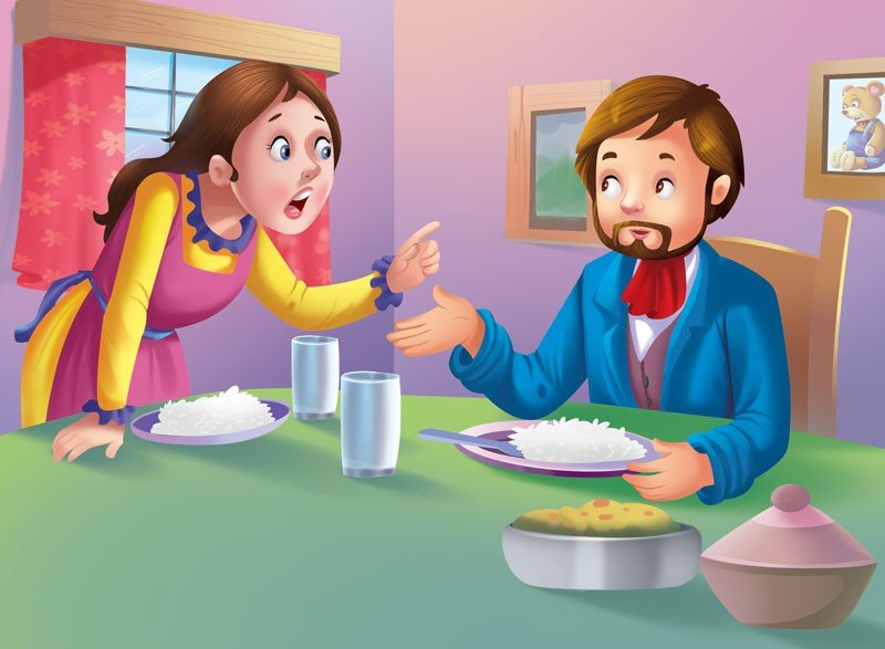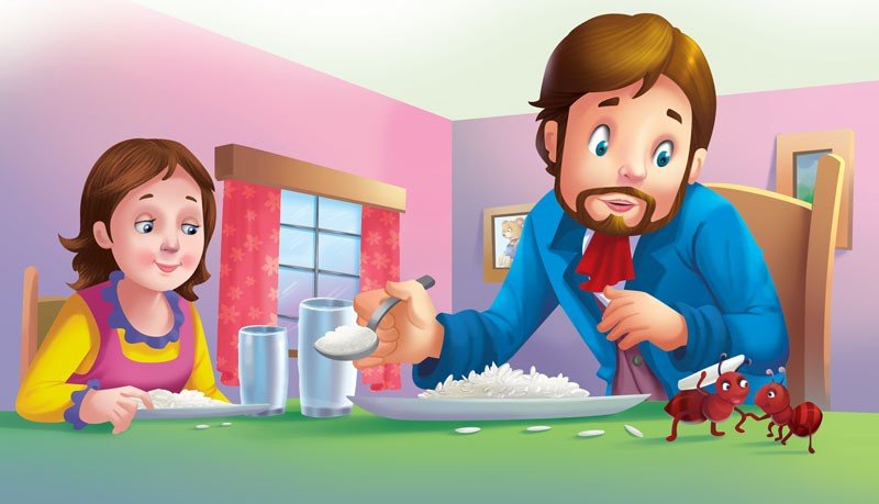 The merchant thanked the fairy and went home happily. One day, when he and his wife were having lunch, he saw an ant picking up some grains of rice from the table.