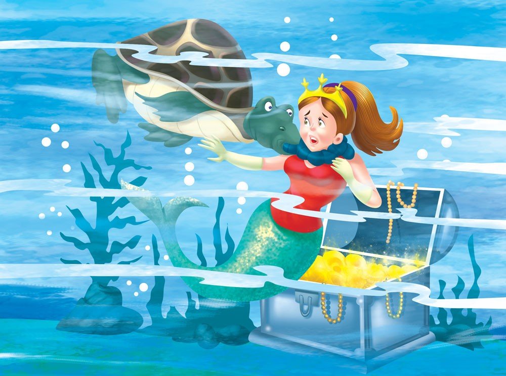 Once, there was a mermaid called Pearl. She was very pretty and the other mermaids were jealous of her. But she was too proud of herself. Now, Terry Turtle liked Pearl but she did not notice him. One day, Pearl came to know about a treasure chest filled with precious jewels. It was inside a sunken ship. Pearl decided to get the chest. She swam to the ship and found the chest. She opened the chest and found many precious jewels. Pearl lifted out a necklace and put it around her neck. Pearl tried to swim but the necklace was so heavy that she could not move. Pearl cried out for help. Terry came to her rescue at once. He said, “You do not need any jewels, Pearl. You are pretty without them.” Pearl said, “I have learnt my lesson and will never be greedy again.”
