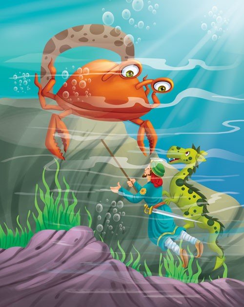 Hatim came across a river where he took out his magical staff and instantly it turned into a boat! In the middle of the river, Hatim felt something grabbing him! It took him into the depths of the river. When it stopped, Hatim opened his eyes and saw a sea dragon. It said to him, “I have brought you here to drive the crab out of my house.” “Why don’t you do it yourself?” No sooner had Hatim asked that question than he heard a loud cry that frightened him. He saw a monstrous crab coming towards him. Hatim took out his staff and when the crab grasped it, it became docile. Hatim asked it to leave the sea dragon’s home for good. He also told the sea dragon not to attack the crab, who had become docile now. After resolving the differences between the two inhabitants of the deep river, Hatim continued his journey.
