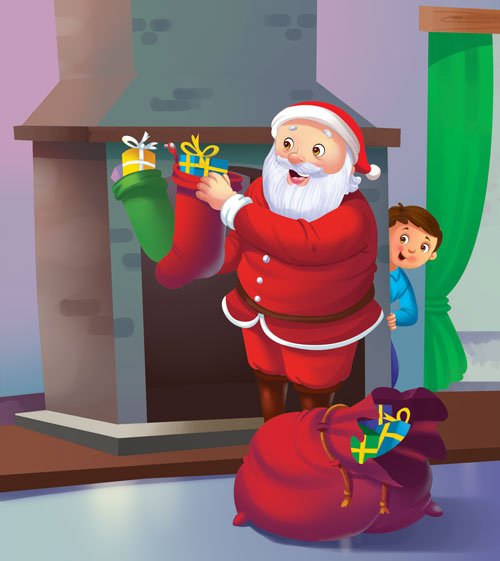 It was the night before Christmas. The stockings were hung by the chimney waiting to be filled. The children were snuggled in their beds. When out on the lawn there arose such a rattle, I sprang from the bed to see what the matter was. I saw a small sleigh, and eight tiny reindeers with a little old driver. I knew it must be Saint Nick. Down the chimney came Saint Nicholas with a bound. He was dressed all in fur. A bundle of toys he had flung on his back. His eyes twinkled! How merry his dimples! He was chubby and plump, a right jolly old elf. I laughed when I saw him. He spoke not a word, but filled all the stockings. Then, up the chimney he rose. And as he flew in his sleigh, I heard him exclaim, “Merry Christmas to all, and to all a very good night!”