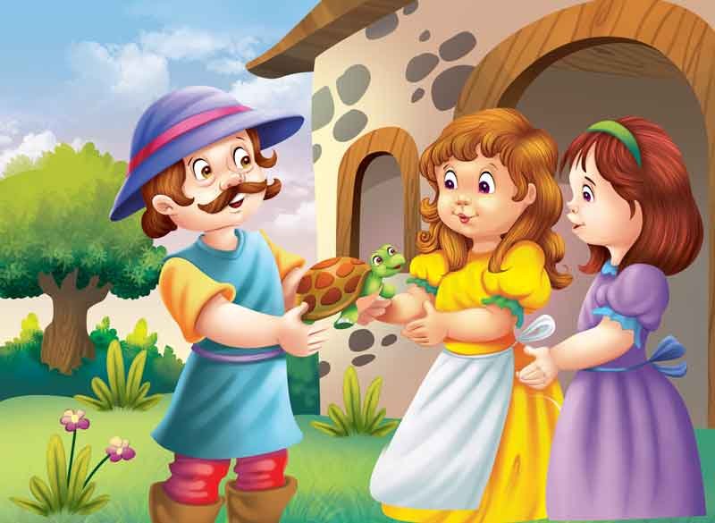 On the way, a panther ate up the widow and her son. He wore her clothes and put on her spectacles and went to her house. When he knocked, the widow’s daughters found her big eyes, a spotted face and large paws strange. So, they wouldn’t open the door.