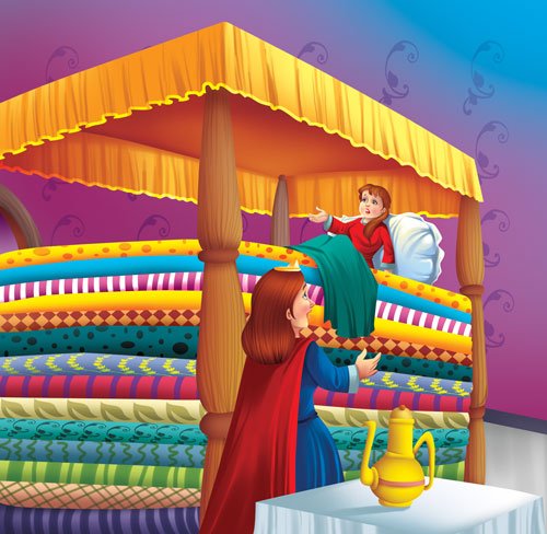 The king and the queen wanted a real princess to marry their son. One stormy night, someone knocked at the palace door and they found a wet girl standing outside. She said that she was a princess who had lost her way. The queen decided to test her to see if she was a real princess. She gave her dry clothes, and after giving her a hot dinner, she took her to sleep in a room where a hundred mattresses were piled up over a small pea. The next day, she asked the princess if she had slept well. “No!” replied the princess, “Something small and hard under the mattress was poking me all night!” The queen realised that only a real princess could have been made uncomfortable by a little pea under a hundred mattresses! And she was delighted to have found a bride for her son finally!