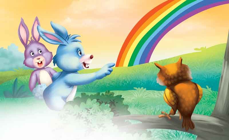 The owl realised that they were so stupid that there was no use telling them anything truly about rainbows. So he told them, “Boys, you have to wait till it rains again. Then the rain fairy will help a new rainbow to grow on the tree.”