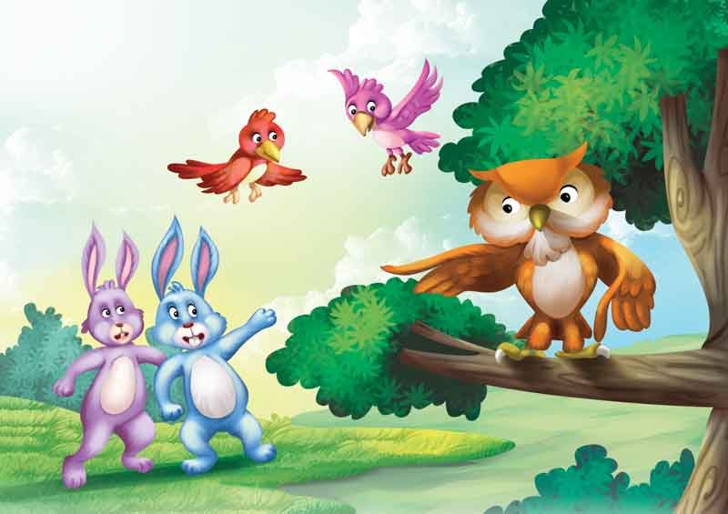 On the tree lived an old owl who was very sensible. He tried to teach the two rabbits some sense always. He told them fruits normally fell off trees and they could eat them then. But the two fellows thought fruits were brought by the wind and dropped in the forest.