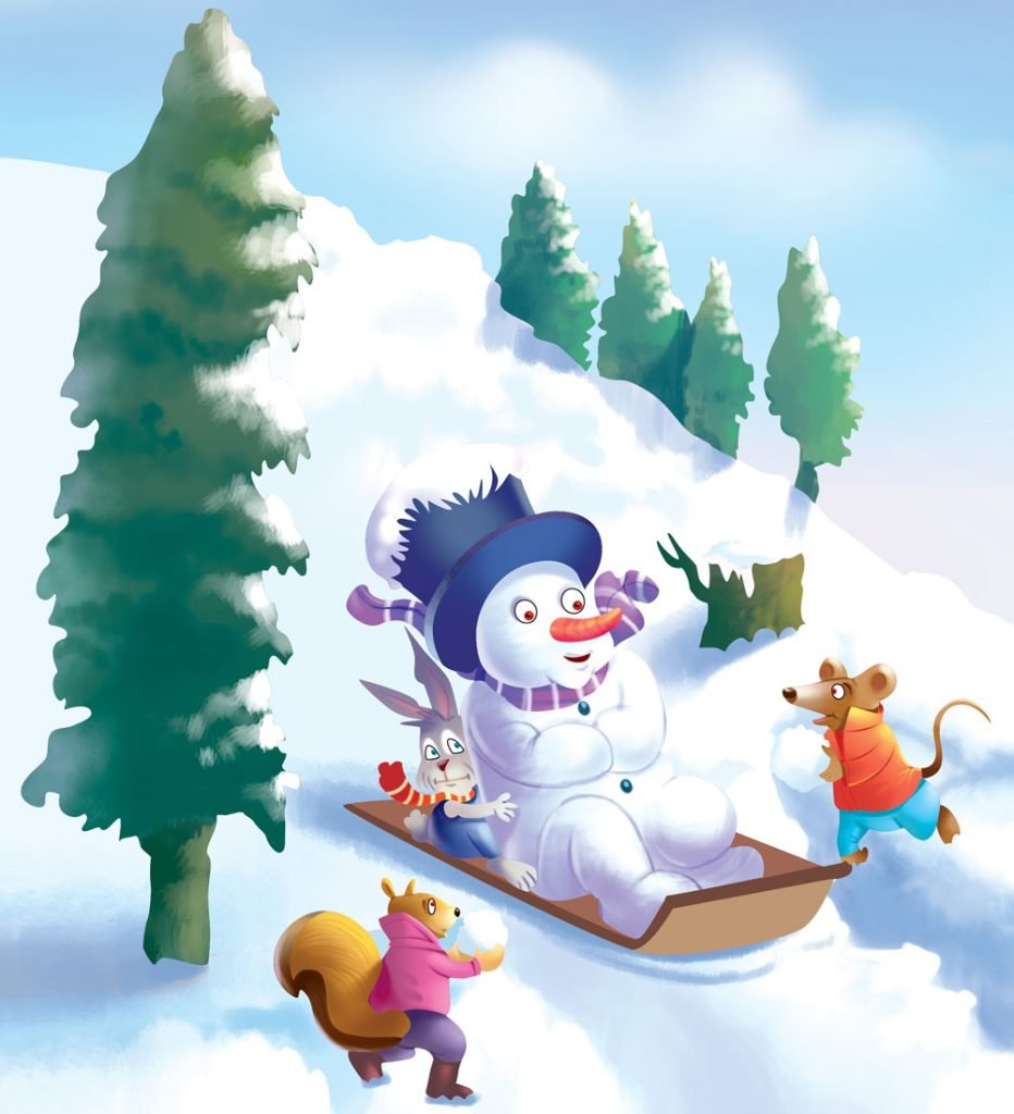 Dan Squirrel and Milly Mole were excited. They had been waiting for the snow for a long time. Finally, it started snowing. Now they could go sledging. So, off they went in the snow. But they could not find the sledge anywhere. So, they decided to play with the snow. They started throwing snow at each other. Suddenly they saw their friend Digo Rabbit sliding down the snow on a sledge. And before him sitting on the sledge was a Snowman. Digo had made him. Digo shouted out, “Hi! Do you want to sit on the sledge with the Snowman?” Well, Dan Squirrel and Milly Mole were happy as this was what they had wanted all along. Both shouted together, “Yes!” So, they went sliding down the hill on the sledge. Turn by turn they sat on the sledge behind the Snowman. It was so much fun.