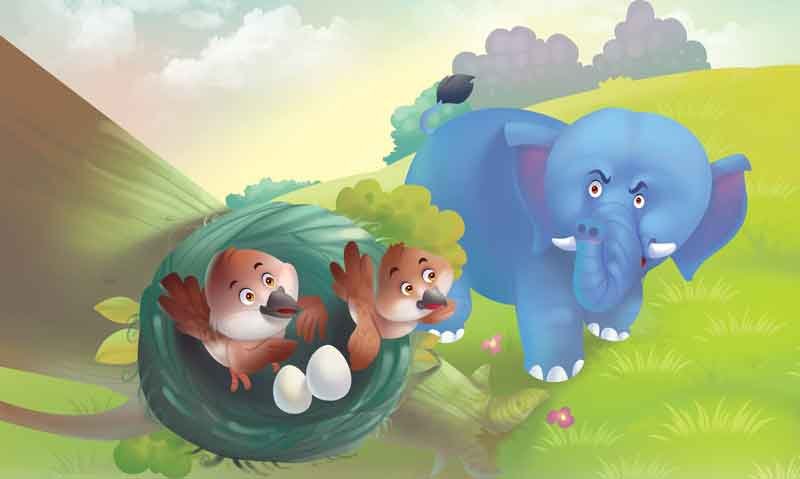 “My little ones are all dead,” she wept, “they have been killed by that awful elephant who attacked our tree. I must destroy him! Will you help me find a way, please?” asked the sparrow.