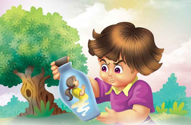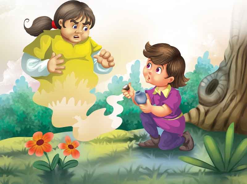 Muttering with rage, the spirit slid into the bottle to prove that he had indeed been inside it. The boy promptly shut the bottle with the cork and the spirit was imprisoned again. “Oh, please let me out!” wailed the spirit, “I’m so sorry. I won’t harm you. Please let me out. I’ll reward you as I had thought earlier.”