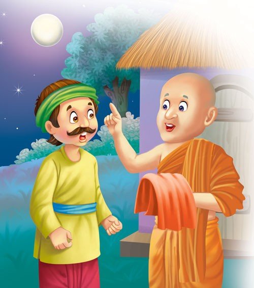 A monk lived a simple life in a small hut. One night, when the monk was in the forest, a thief entered the hut. However, he found nothing to steal. Just then, the monk returned. “I am sure you have come a long way to visit my humble hut,” he said to the thief, “I will not let you return home emptyhanded. Please take my clothes as a gift.” The thief was shocked. He had never met someone who readily gave away his only possession! As he was about to run away, the monk pointed at the moon, “I wish I could give you this beautiful moon, but the precious things in life are for all to share and not to hide or steal!” The thief was so impressed by the monk that he stopped stealing and became his disciple.
