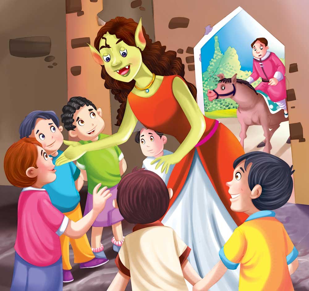 The King loved his son dearly and, when the son wished to go hunting, the King sent his Vazir with him to watch over him. Once, the Prince galloped through the forest, leaving the Vazir and the attendants behind. The Prince suddenly found himself alone and there was no sign of the Vazir! He saw a beautiful lady who looked like a princess, sitting by a path, looking miserable. She said, she had fallen off her horse and it had bolted. The Prince put her on his horse and took her to her home. To his surprise, she stopped at a ruined palace. As he waited, he heard her speak, saying, “Children! I have brought a fat young man for you to eat!” Horrified, he realised the danger, for she was really an ogress! He leapt onto his horse and raced all the way back home. For having lost the Prince, the poor Vazir was punished!