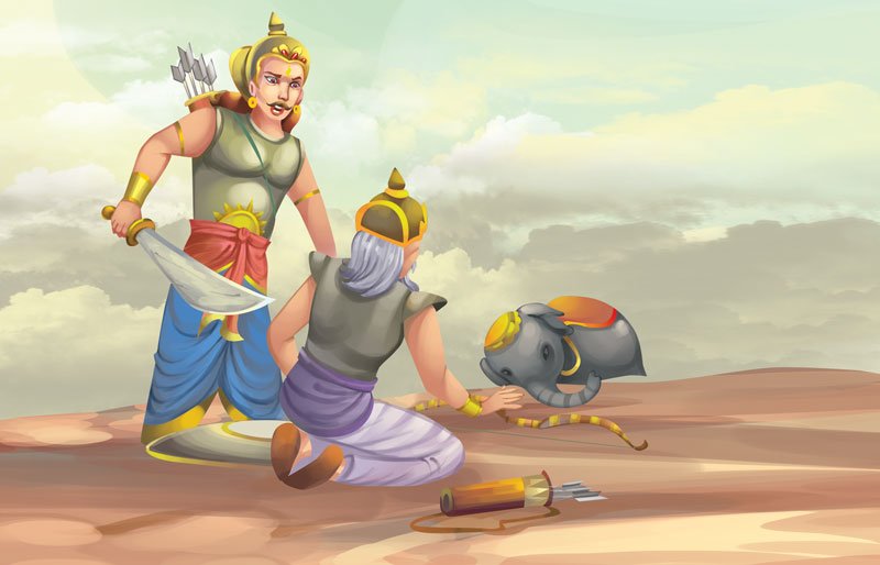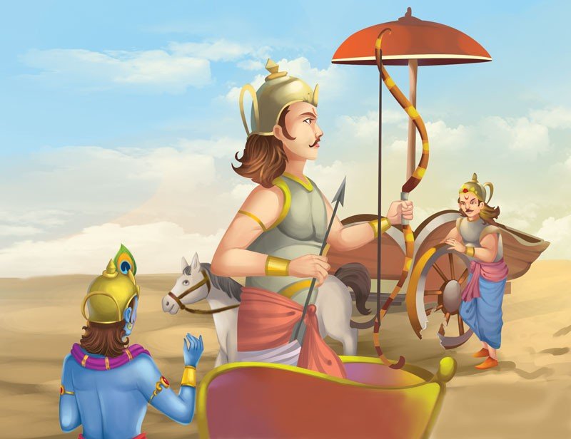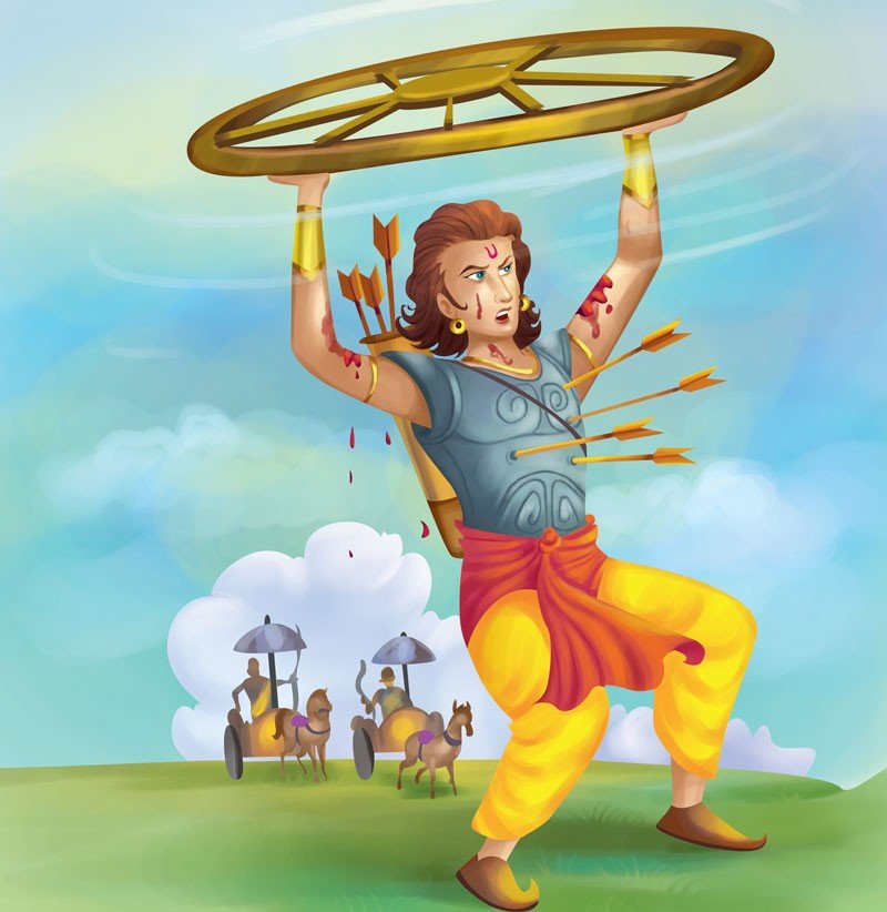 When Karna soon stood face to face with Arjun, his charioteer was suddenly killed and one of the wheels of the chariot broke down. Karna requested, “Arjun, stop fighting while my wheel is fixed. I am unarmed and it is unethical to attack me.”