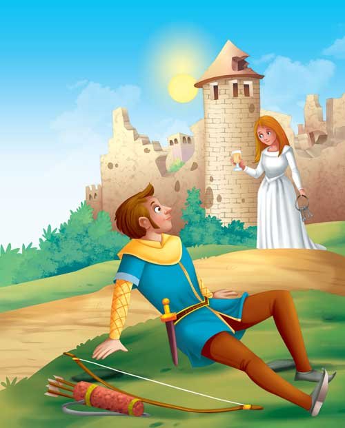 Once upon a time, there was a castle in a valley near the Rhine River. Now, it lay desolate and in ruins. One summer afternoon, a young nobleman was out hunting and he chased a fox all the way up into the valley. But he lost the fox along the way and decided to go up to the castle and rest a bit because it was very hot. By the time he reached the ruins and flung himself down on the grass in the shadow of a tower, he was exhausted. ‘I wish someone would give me some cool wine to drink!’ he said aloud to himself. Suddenly, he found a beautiful maiden, dressed all in white, with flaxen hair and white skin, coming towards him with a goblet of wine in one hand and a bunch of keys in the other! “Here you are!” she said, offering him the goblet of wine.