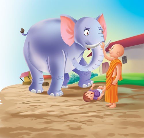 The Bodhisattva took many births as an ascetic. But this time, he came as the most powerful ascetic in the world. He had many followers. During the same time, there was another ascetic who was envious of the Bodhisattva. He thought of a plan to remove the Bodhisattva from his path. He told one of the elephant-keepers to make drunk a fierce elephant and let it loose on the Bodhisattva’s path. So, the elephant was let loose. All the people in the street started running here and there. But the Bodhisattva calmly continued walking on his path. A man came running down the path and unintentionally dropped his baby at the Bodhisattva’s feet. Just as the intoxicated elephant was about to walk over them, the Bodhisattva kept his hand on the elephant’s head and quietly stroked it. The elephant became quiet and bowed its head in front of the Bodhisattva. Everyone was surprised to see this miracle.
