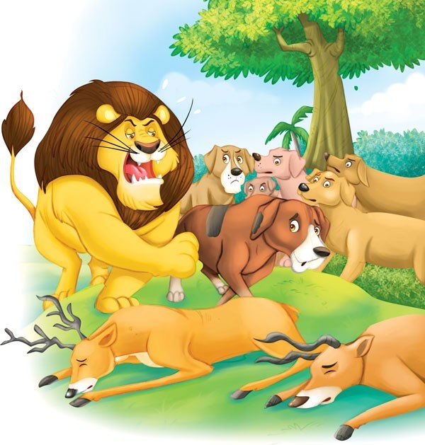 Once upon a time, there were nine dogs that went out to hunt. On the way, they met a lion. The lion said, “I am hunting too. Let us hunt together.” So, the lion and the dogs hunted together. They caught ten antelopes. Then, they decided to divide the meat among themselves. One of the dogs said, “This is easy. We are ten, and there are ten antelopes. So, each one of us will have one antelope.” The lion was furious. He hit the poor dog and blinded him. The other dogs were silent. Suddenly, one of the dogs came forward and said, “We must give nine antelopes to the lion. Then, they will be ten in all. And we dogs shall take one antelope and then we will also be ten together.” The lion was happy with his answer and asked “Who taught you to divide like this? You are a wise dog.” The dog answered “O King, you hit my brother and blinded him. That blind brother taught me!”