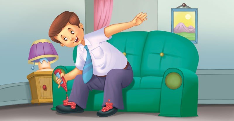 The next day, Tony thought he would try out his bright idea. He always had trouble with his buttons and his shoe laces. Why not gum them up? So, he went into Papa’s study and got the bottle of glue. He spread it on his laces as he put on his shoes and just stuck them on. Then he put on his shirt and put a lot of glue along the row of buttons and stuck the shirt down.