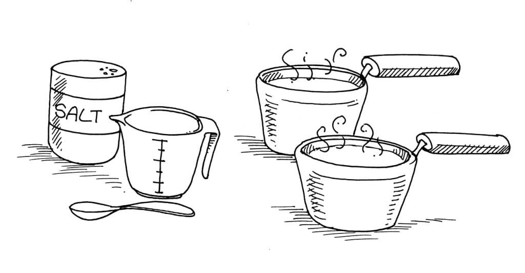 Add two tablespoonfuls of salt to two cups of water. Stir and pour half into one pot and half into the other.