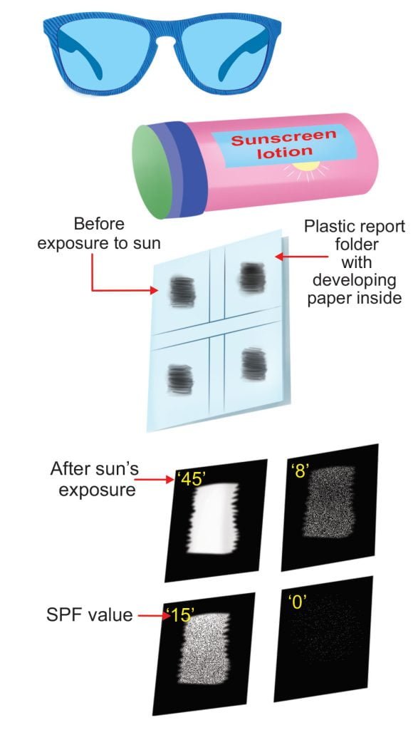 - Once they are rinsed, place the photo reactive paper under a label with the appropriate SPF written under it.