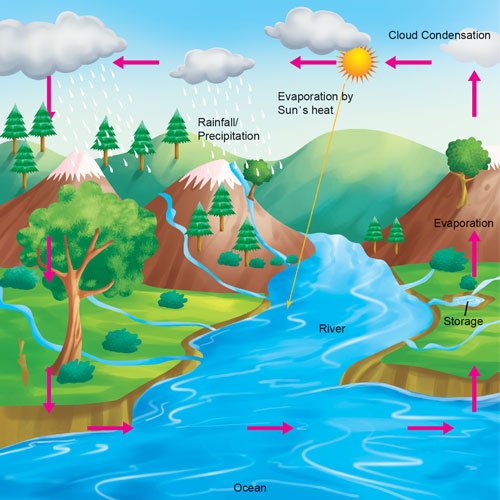 Water cycle is the continuous movement of water in the atmosphere. Water present in ponds, lakes, rivers, seas and oceans changes its form and converts to water vapour due to the heat of the atmosphere (evaporation). As the water vapour rises, the low temperature of atmosphere causes condensation of the water vapour. Tiny drops of water thus formed join together to form clouds. The lighter clouds keep on growing in size. They are moved from one place to another with the help of air. When the clouds become too heavy, it becomes difficult for them to hold water, and this results in rain (precipitation). The rain water gets collected in the water bodies present on the Earth. This whole process of movement of water is called water cycle.
