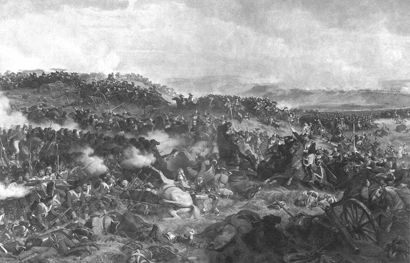 The hollow was undoubtedly there at the time, although it has since been filled up, and, it is believed, was likewise the grave of the 15 hundred men and two thousand horses that were eventually collected from round about. The British reserve cavalry, supported by the infantry fire and a few hastily collected batteries, completed the defeat of Ney’s first charge. A second was repulsed in the same way. The undaunted marshal then waited for reinforcements. No fewer than 37 squadrons came in, Napoleon sending Kellermann’s heavy dragoons as a last resort. Guyot’s division of the heavy cavalry of the guard was also there—some say they had been summoned by Ney, others that they came of their own accord; the question arises because, in the next stage of the battle, their absence from the station assigned to them was a serious matter. Another time, and still another, this mighty force moved against the foe. Pouring in and out, backward and forward, among the squares, they lost cohesion and force until, in the very moment of Wellington’s extremity, they withdrew, as before, exhausted and spent.