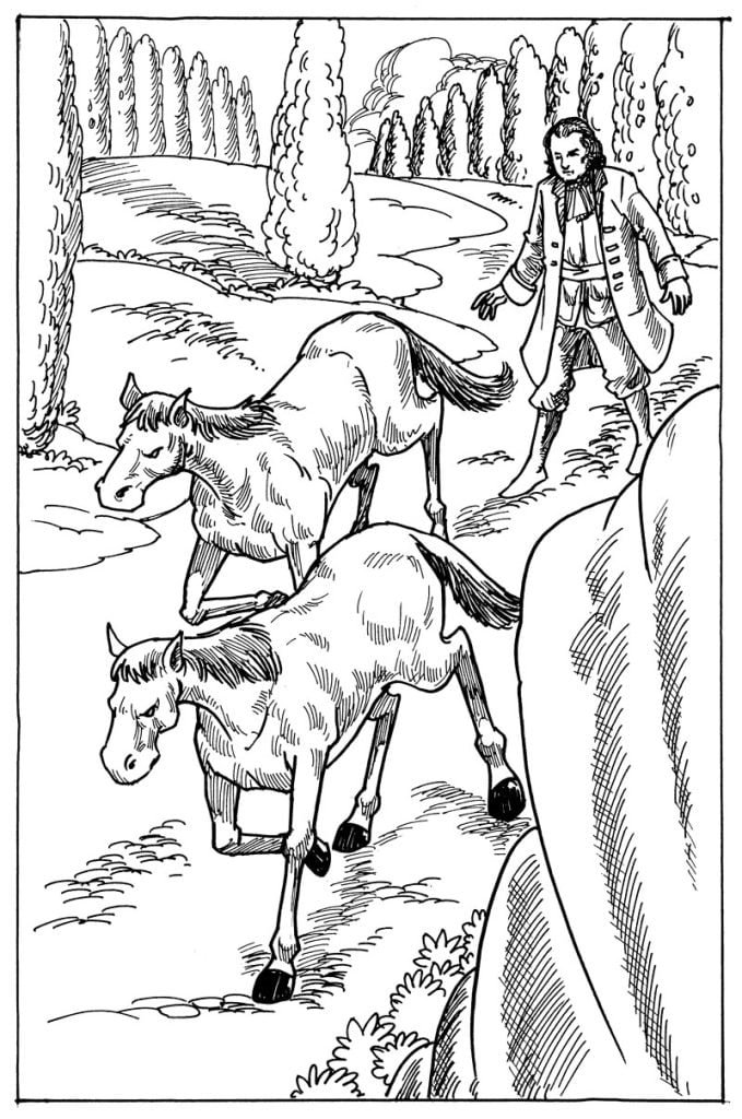 As I stood in front of the horse, I saw another horse come down the road. The first horse neighed to the second one and he walked over to us. They struck each other’s right hoof. Then both began to neigh to each other. They started walking side by side, backward and forward, like human being discussing over some matter. They often turned their eyes towards me, as if they were to watch that I might not escape.